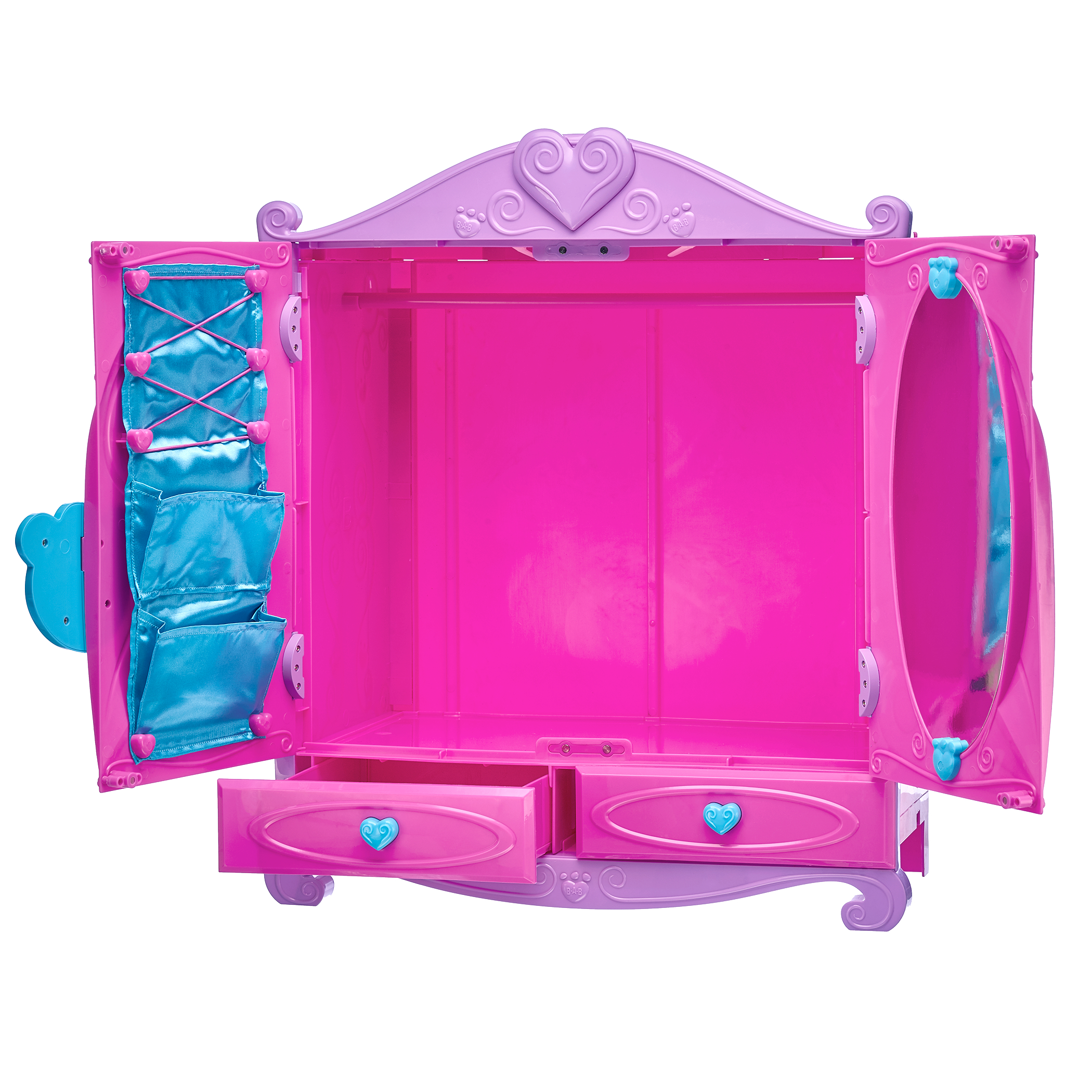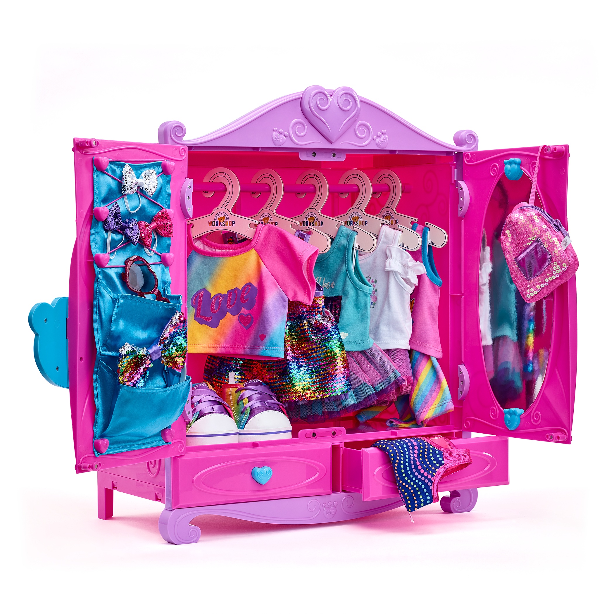 Keep all of your furry friend´s outfits and accessories organized inside this Fancy Fashion Boutique! This toy fashion case includes a mirror, a bar for hanging clothes, drawers, elastic holders and pockets. Organization has never been this cute and cuddly! This functional toy fashion set makes a great gift for any stuffed animal collector.